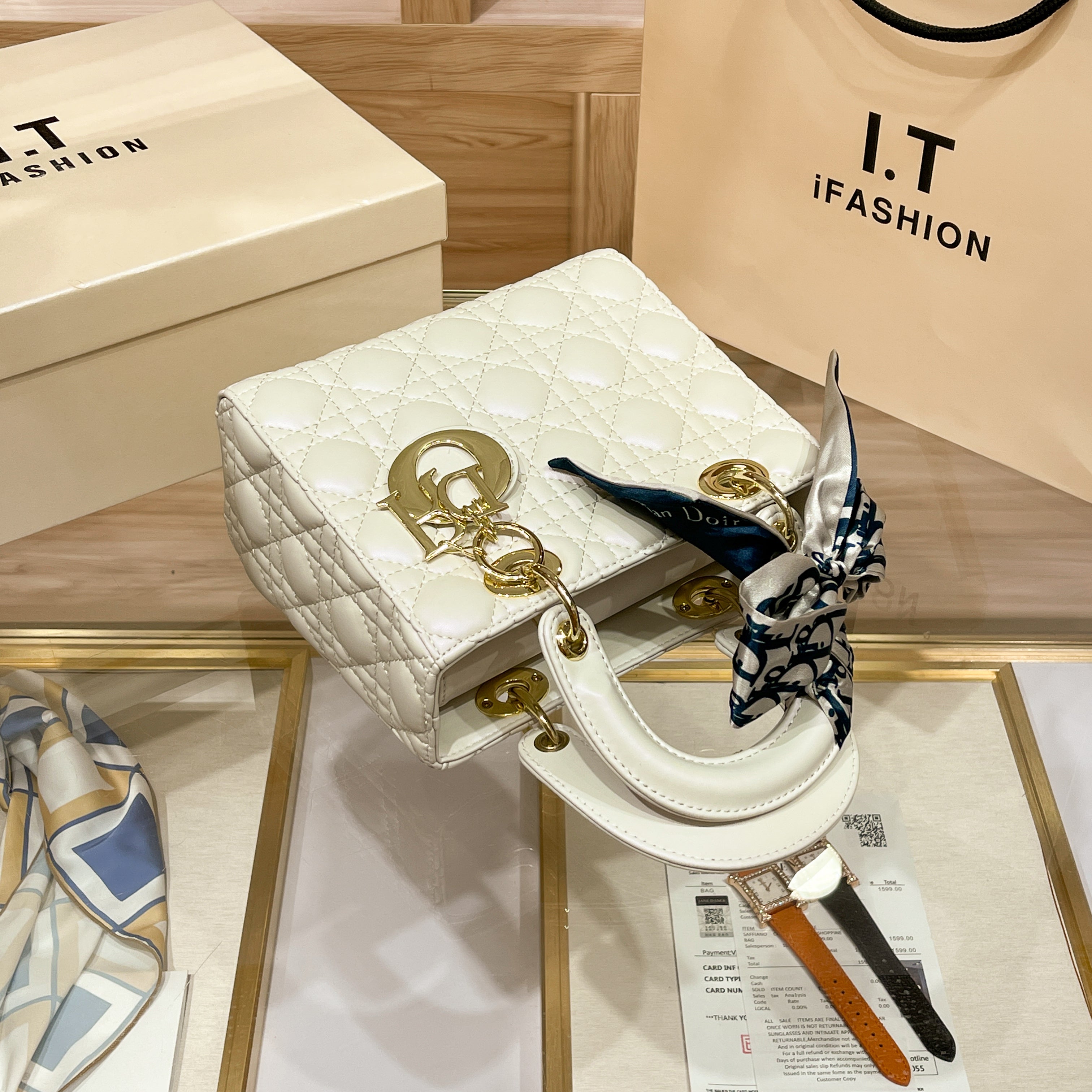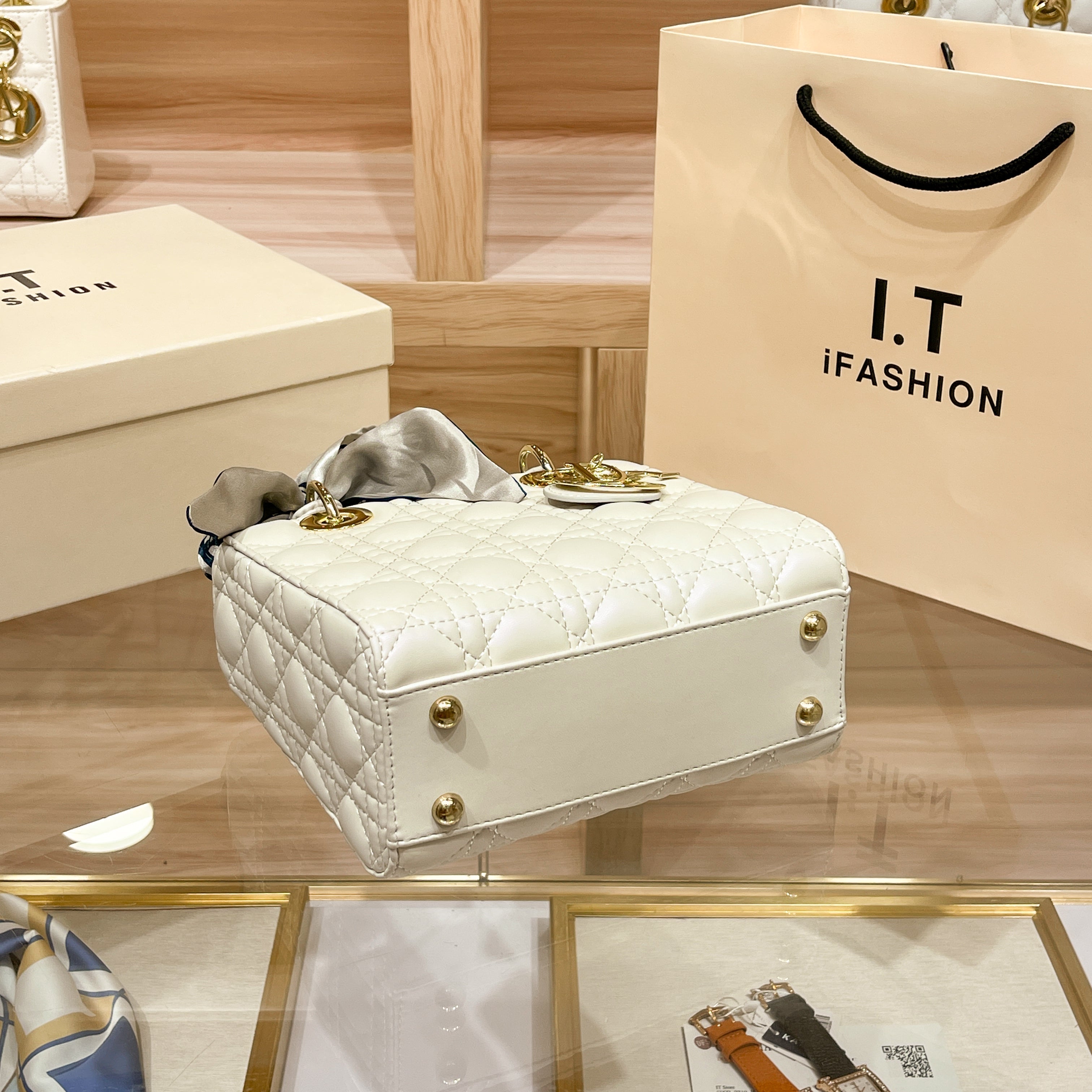 Elegant quilted finish with a glossy, soft-touchsurface . Golden charm accents for a refined,luxurious vibe Includes a detachable shoulderstrap for versatile use . Structured, compact, andperfect for everyday or special events.